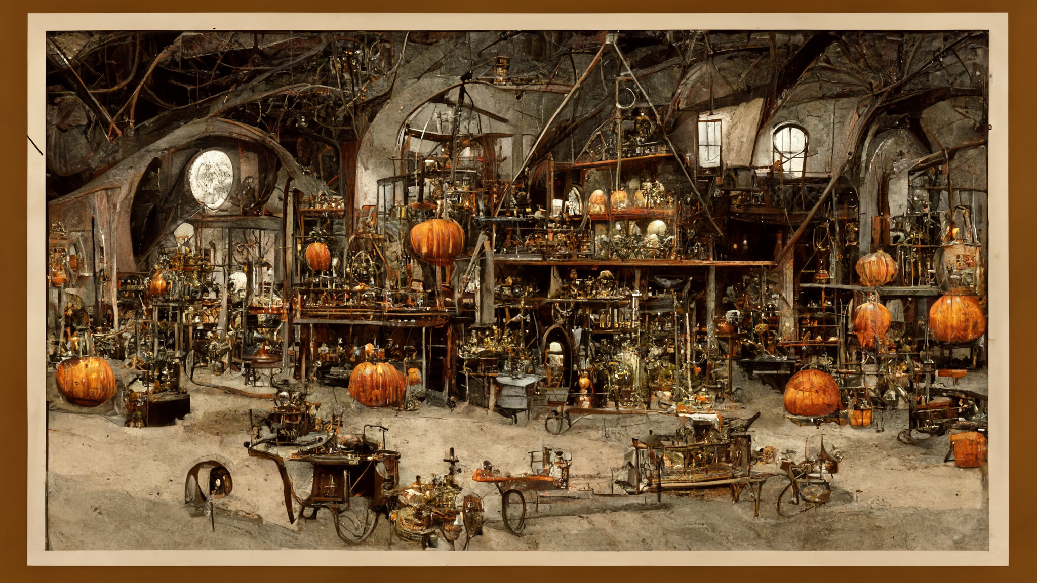 prompt: industrial warehouse, halloween decoration factory, high ceilings, halloweentown, pumpkins, skeletons, bats, witches, cauldrons, spooky, highly detailed, hand drawn, folk art, elaborate, cinematic, silver accents, illustration, halloween, drawn by da Vinci, sharpened, HD 8k